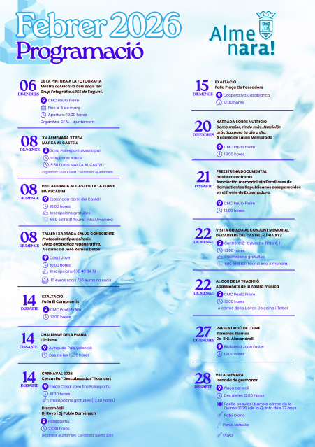 El Ayuntamiento de Almenara ha presentado la programación cultural, deportiva y festiva para febrero de 2026, con una oferta diversa dirigida a todos los públicos. Entre los actos más destacados figuran el Carnaval 2026 y la jornada festiva de hermandad Viu Almenara.
