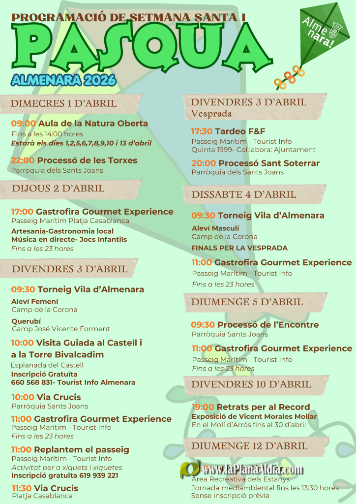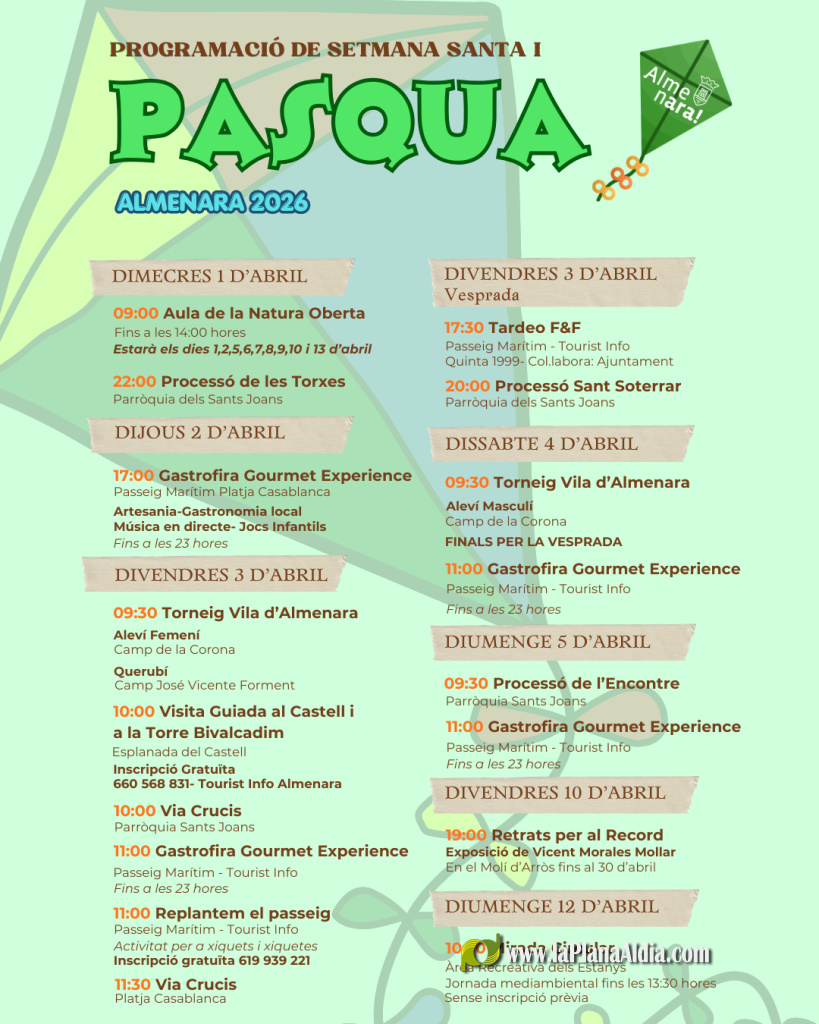 El Ayuntamiento de Almenara ha presentado la programación de Semana Santa y Pascua 2026, una agenda repleta de actividades lúdicas, deportivas, culturales, ambientales y religiosas, entre las que destacan la Gastrofira Gourmet Experience y el Torneig Vila d'Almenara de fútbol base.