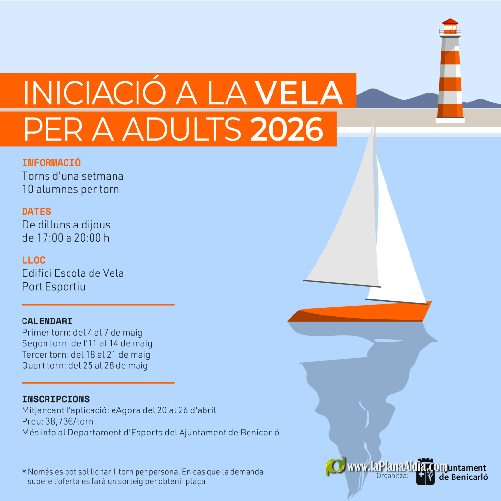 Benicarló pone en marcha un nuevo curso de iniciación a la vela para adultos, dentro de la Campaña Esportiva Municipal 2025-2026, con el objetivo de ampliar las opciones de práctica deportiva para la población adulta y aprovechar un entorno natural privilegiado como es la mar.