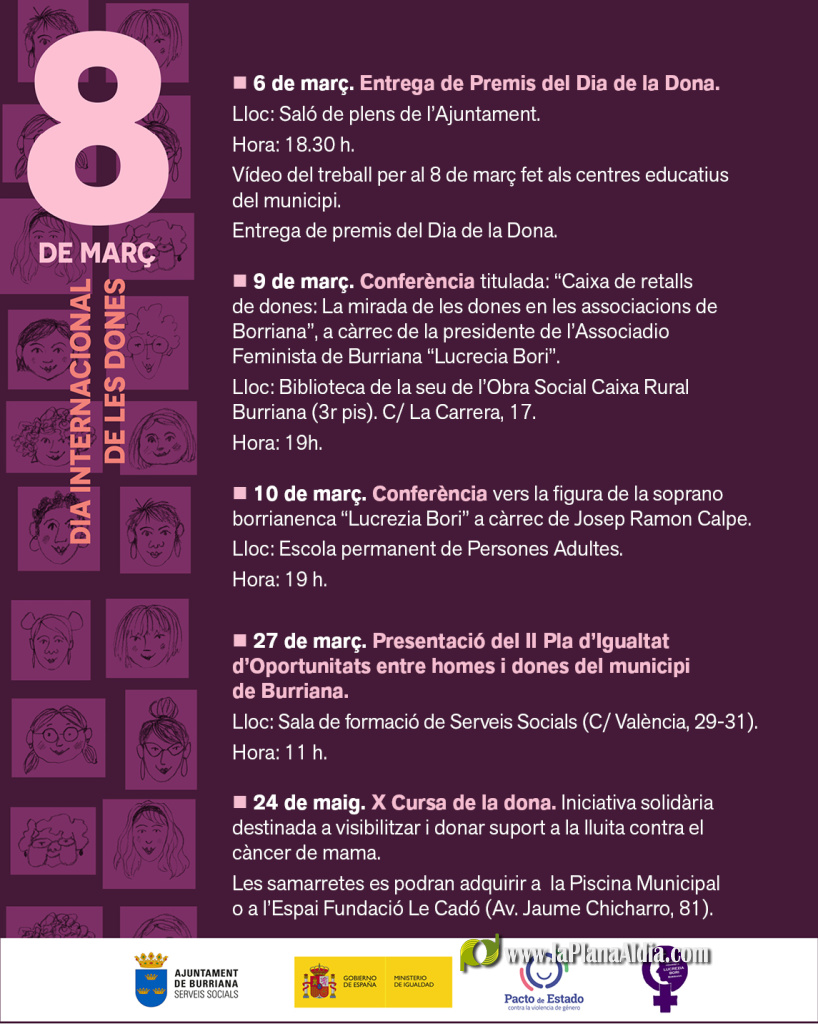 27 de marzo. Presentación del II Plan de Igualdad de Oportunidades entre hombres y mujeres del municipio de Burriana. Lugar: Sala de formación de Serveis Socials (C/ València, 29-31). Hora: 11 h.