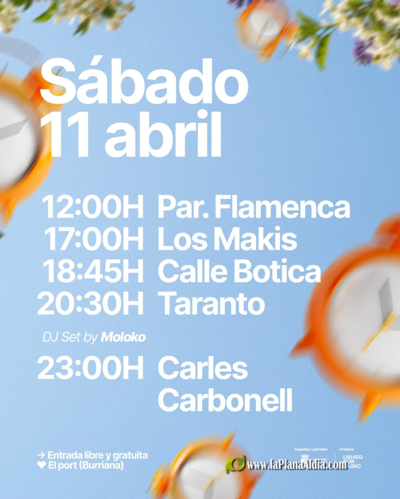 El sábado 11 de abril, la música continuará sin tregua desde el mediodía: Paradita Flamenca actuará a las 12:00h, seguido por Los Makis a las 17:00h, Calle Botica a las 18:45h y Taranto a las 20:30h. Tras una nueva intervención de Moloko, Carles Carbonell cerrará el festival a las 23:00h.