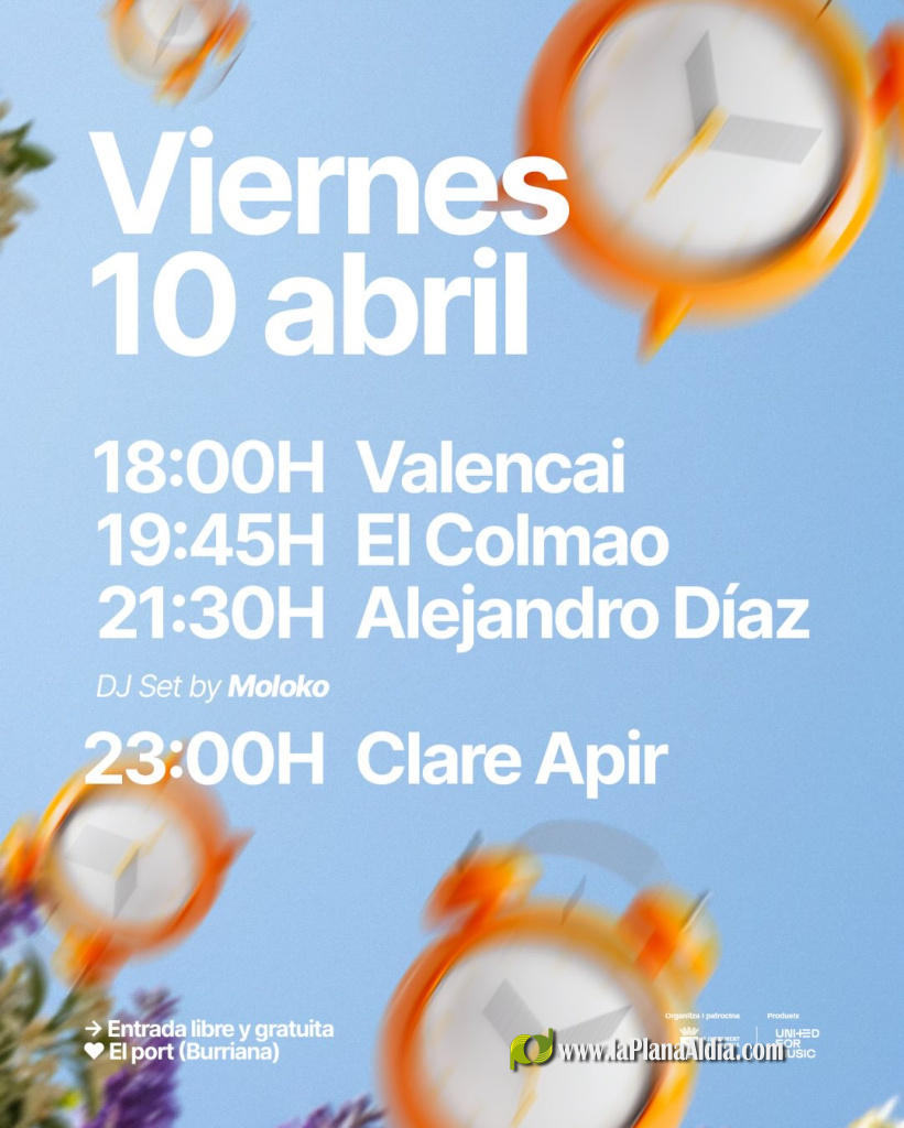 La programación arrancará el viernes 10 de abril a las 18:00h, cuando el escenario del Puerto reciba a Valencai para abrir la jornada. A las 19:45h tomarán escena El Colmao y a las 21:30h, Alejandro Díaz, antes de las sesiones nocturnas. La noche culminará con un DJ Set de Moloko y la actuación de Clare Apir a las 23:00h.