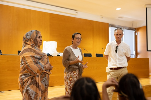 La Universitat Jaume I ha vuelto a ser el punto de recepción para 13 niños y niñas que se han desplazado desde los campamentos de refugiados saharauis en Tindouf (Argelia) a Castellón, donde pasarán el verano con familias de acogida. La recepción, celebrada en la Universitat, ha estado presidida por la vicerrectora de Responsabilidad Social, Políticas Inclusivas e Igualdad, Elsa González Esteban. Las representantes de las asociaciones de solidaridad y apoyo al pueblo saharaui, junto con las familias acogedoras, han agradecido la buena disposición de la UJI como lugar de referencia para facilitar el encuentro entre las familias y los niños y niñas.