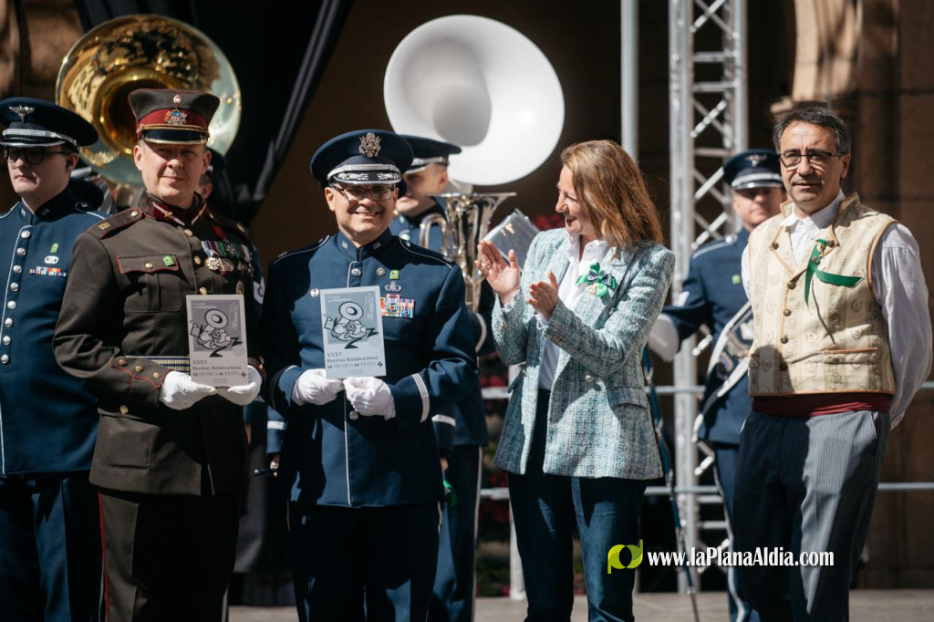La Plaza Mayor lució con la vistosidad de atuendos y coreografías, y las agrupaciones interpretaron temas que iban desde bandas sonoras y pop hasta marchas y piezas tradicionales como Paquito el Chocolatero, Magdalena Festa Plena y Rotllo i Canya.