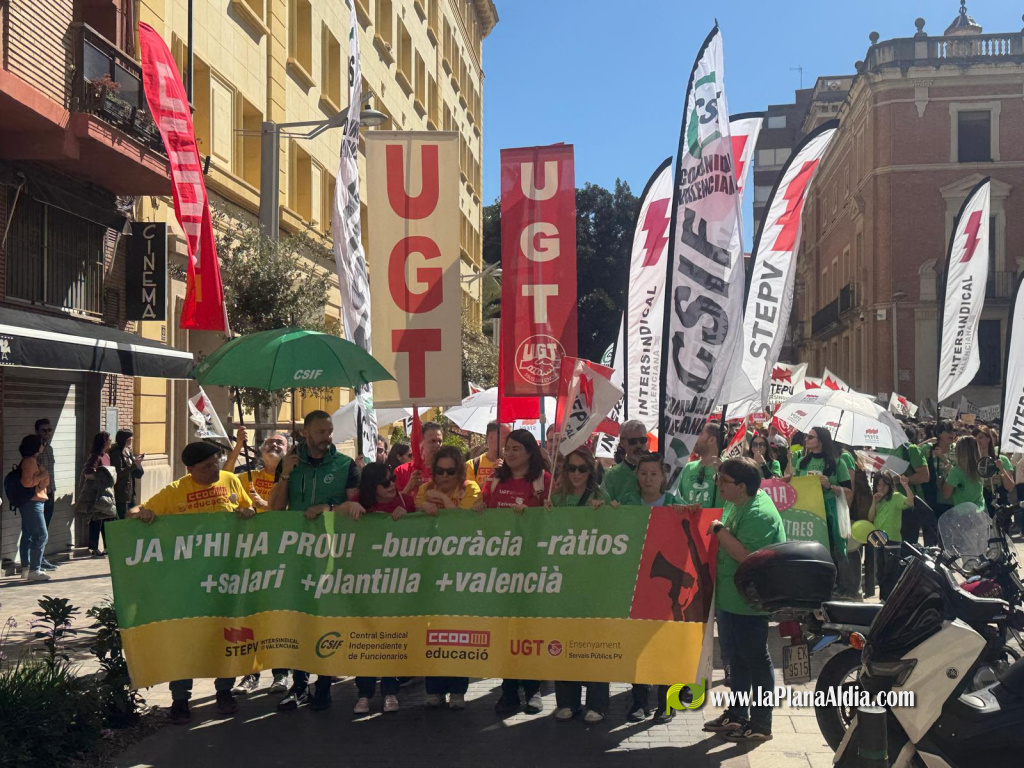 La concentración, que partió frente a la Dirección Territorial de Educación de Castellón y recorrió el centro de la ciudad, contó con docentes, personal de administración y servicios, alumnado y familias y evidenció el profundo malestar ante la falta de avances en la mesa de negociación.
