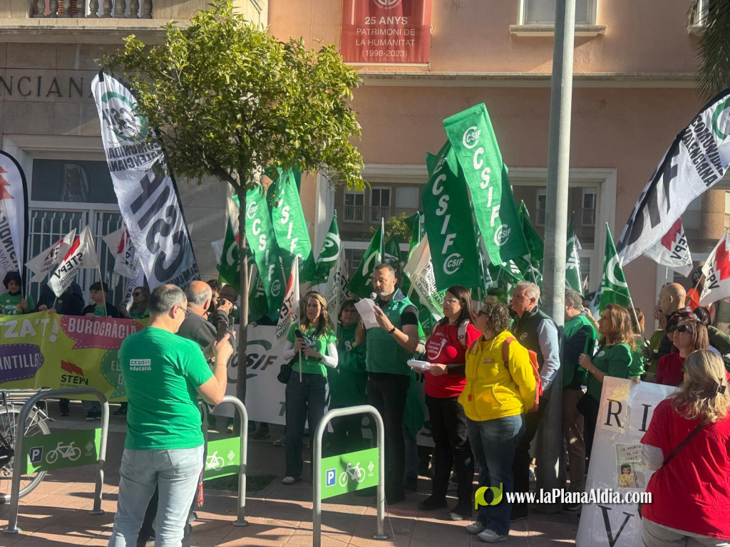Representantes de CSIF, STEPV, ANPE, CCOO y UGT se movilizaron en Castellón este martes, 31 de marzo de 2026, para exigir la apertura inmediata de una negociación real con la Conselleria de Educación, dentro del calendario de protestas impulsado en la Comunitat Valenciana.