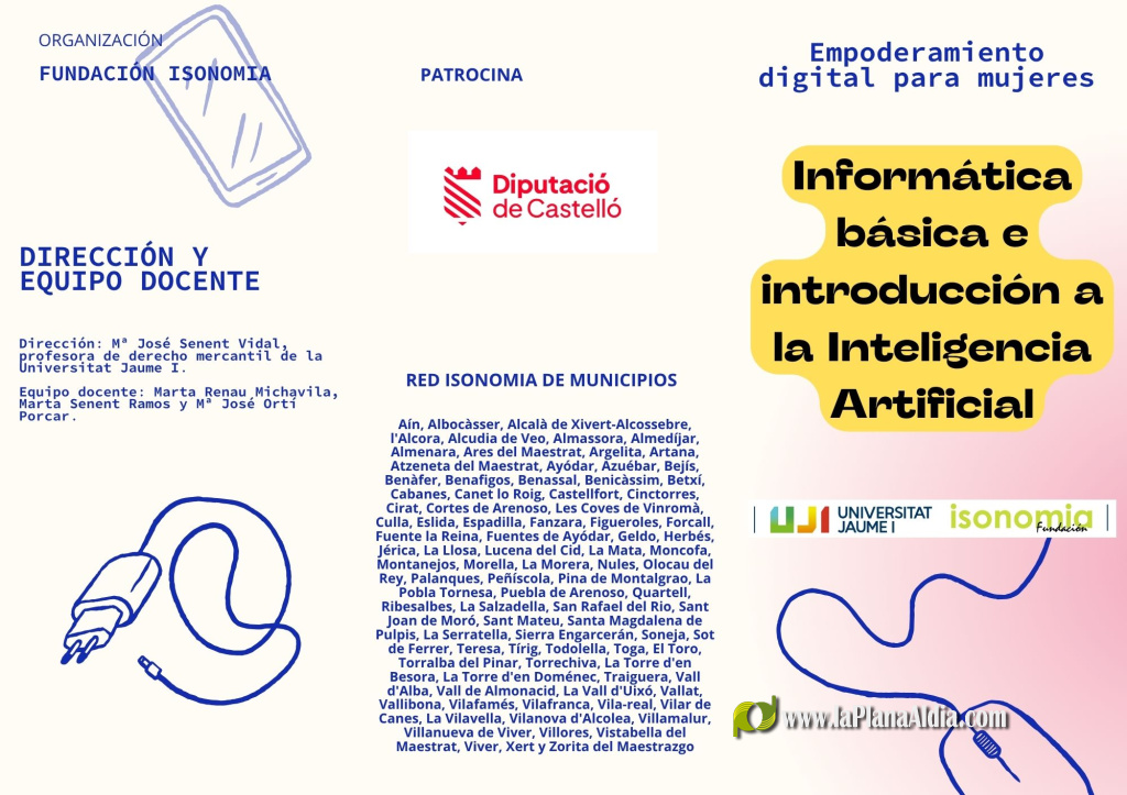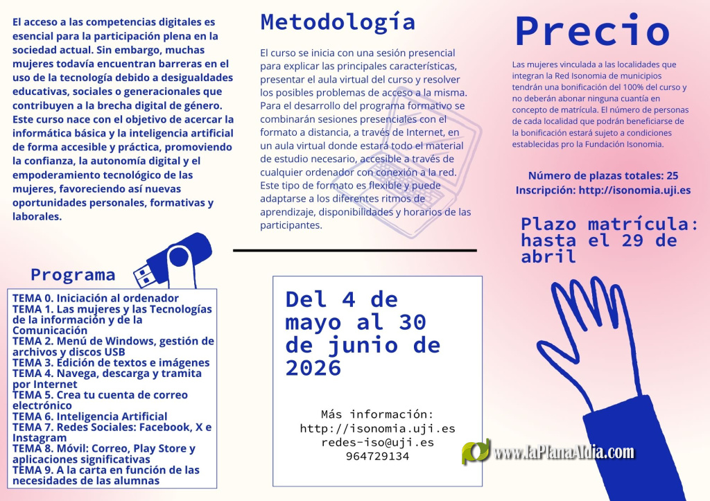 Más información y formulario de inscripción en: https://www.uji.es/institucional/estructura/entitats/isonomia/base/formacio/curs-informatica/
