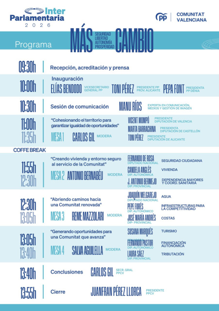 Programa Interparlamentaria: 9,30 h Recepción; 10.00 h Inauguración: Elías Bendodo (Vicesecretario general PP); Toni Pérez (Presidente PP Provincia Alicante); Pepa Font (Presidenta PP Dénia).