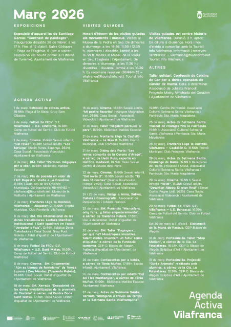 Visitas al Museo de la Pedra en Sec, a la Iglesia y al Ayuntamiento: de miércoles a domingo a las 11:30; viernes y sábados también a las 16:30. Se recomienda reservar llamando al 964441432 o por vilafranca@touristinfo.net.