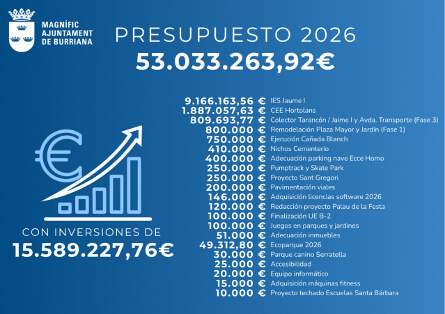 • Burriana presenta el pressupost més gran de la història, 53.033.263,92 euros per a 2026