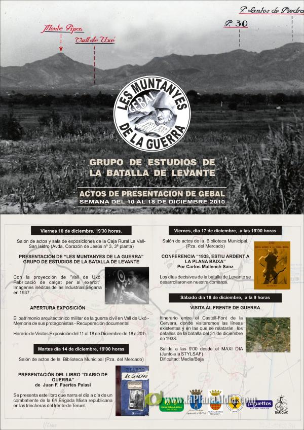 L? Associació Cultural ?Muntanyes de la Guerra? GEBAL (Grup d'Estudis de la Batalla de Llevant) es presenta el pròxim divendres, 10 de desembre, a les 19.30 hores, al Saló d?Actes i Sala d?Exposicions de la Caja Rural San Isidro de La Vall d?Uixó.